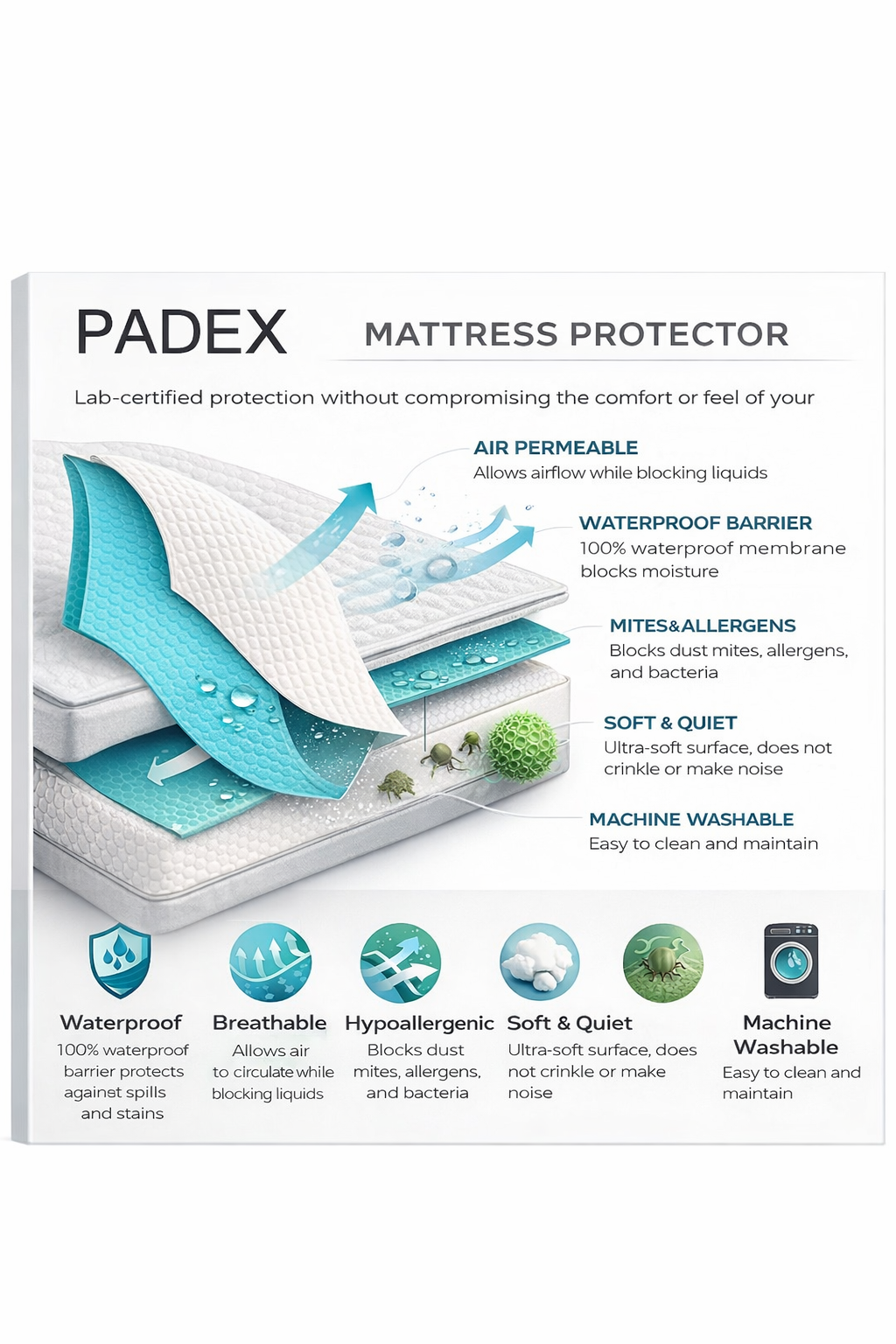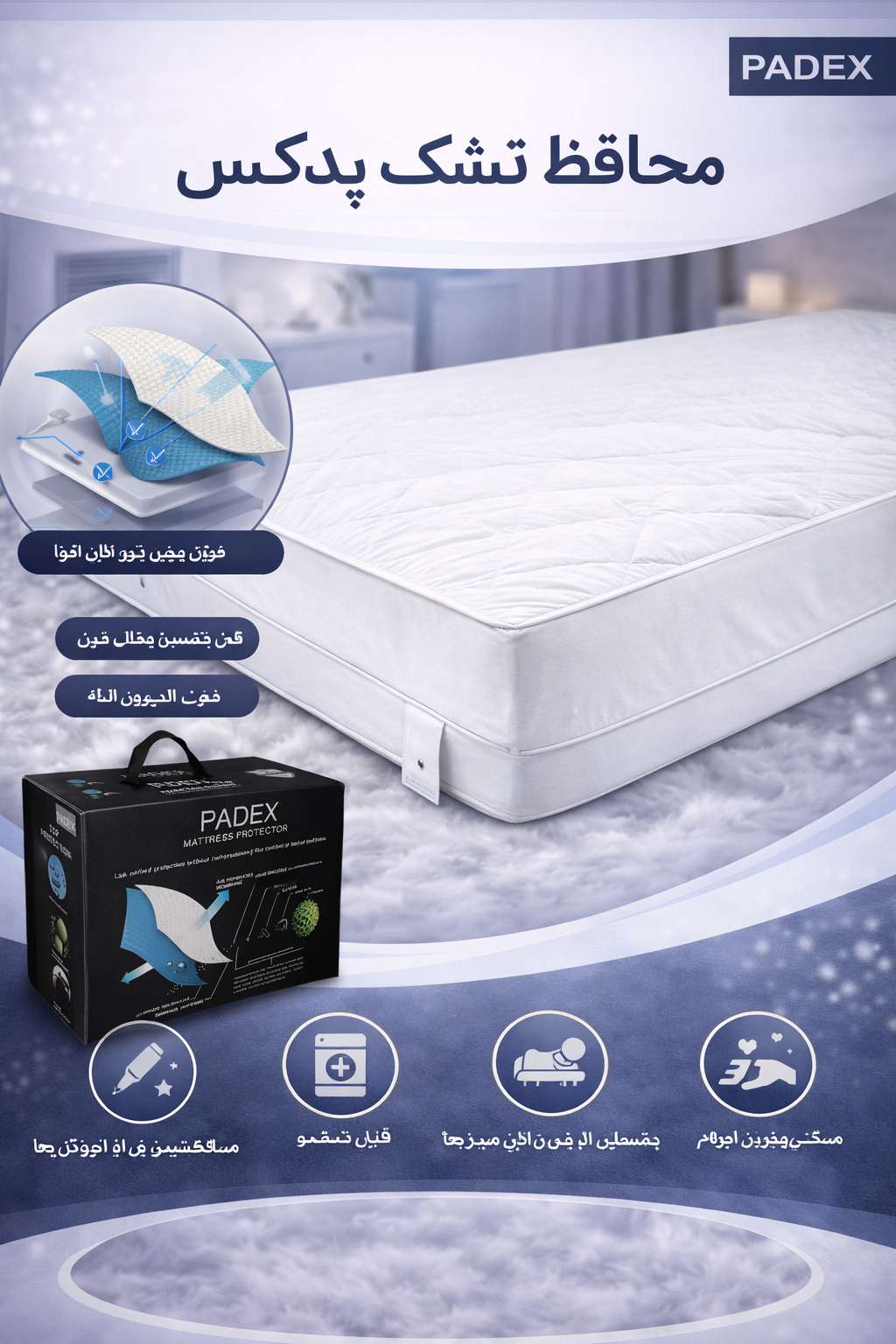 محافظ تشک ضد اب پدکس 200*120 padex برند : پدکس دستهبندی : محافظ برچسبها: 2 سال تکنولوژی گردش هوای محافظ تشک ضد آب پدکس، دارای لایهی UV ضد آب مجهز به فناوری نانو بوده که مولکولهای هوا را از خود عبور داده ولی اجازهی رد شدن به مولکولهای آب را نمیدهد. همچنین به دلیل مقاوم بودن محصول در برابر انواع آلرژی، باکتری، آلودگی و … برای افراد دارای برخی بیماریها نظیر آسم، اگزما و … مناسب میباشد. پارچهی به کار رفته در محافظ تشک پدکس از نوع گردباف ضد آب و آغشته به الیاف آلوئهورا بوده که موجب لطافت، نرمی و جلوگیری از ایجاد الکتریسیته میشود. برای استفاده بی دغدغه از تشک و تمیز ماندن رویه اصلی آنها تا پیش از این راهکار خاصی وجود نداشت و با کثیف و آلوده شدن آن دردسر ببار می آمد. به دلیل غیر قابل شستشو بودن تشک خواب، بهترین وسیله برای حفظ نظافت و پاکیزگی و دوام بیشتر رویه تشک، استفاده از محافظ تشک پدکس است. محافظ تشک به دلیل استفاده از پارچه لمینت شده، علاوه بر حفظ شکل ظاهری تشک، از نفوذ آب و هرگونه مایعات به سطح تشک جلوگیری میکند. نکته اصلی قابلیت شستشوی محافظ است که معمولا محافظ تشک پدکس را می توان با آب دمای پایین به راحتی شست. با استفاده از محافظ تشک پدکس دیگر دغدغه و نگرانی برای بریز و بپاش فرزندان و کثیف شدن رویه تشک آنها ندارید از بابت تمیز تشک اصلی و نو ماندن آن هم خیالتان راحت است. بطور کلی استفاده از محافظ تشک سبب می شود که تشک تخت شما دچار پارگی، ایجاد خراش نشود و در مقابل نفوذ رطوبت و آب از تخت شما مراقبت کند. داشتن محافظ تشک، تشک شما را در برابر باکتری هایی مانند عرق، پرز، کنه گرد و غبار، شوره حیوانات، لوازم آرایشی و حشرات محافظت می کند. استفاده از محافظ تشک، بسته به کیفیت تشک و محافظ، میتواند عمر تشک شما را پنج تا 10 سال افزایش دهد. ویژگی های محافظ تشک پدکس محافظ تشک پدکس دارای پارچه ای با ویژگی های بازدارنده است که از ورود مایعات، گرد و غبار، تعریق و به رویه تشک جلوگیری می کند. این محصول به صورت متحرک و جدا شونده برای تشک به کار میرود. استفاده از محافظ تشک برای پیشگیری از مشکلات ناشی از حوادث و نشت مواد به درون تشک، مواد آلرژی زا، حشرات مانند ساس و حشرات ذرهبینی و آلودگی ها امری ضروری است. استفاده از دو لایه ی پارچه ای و عایق در این محصول، باعث شده میزان مقاومت آن در برابر انواع آلودگی، بو و رطوبت به میزان چشمگیری بالا باشد. محافظ تشک پدکس در ابعاد و اندازه های مختلف در بازار موجود بوده و به فروش می رسد. این محافظ ها دارای ابعاد خاصی بوده و متناسب با تشک های تک نفره و دو نفره طراحی و آماده شده اند. اگر برای نوجوانان می خواهید محافظ تشک خریداری کنید حتما باید به اندازه و ابعاد توجه داشته و از محافظ تشک تک نفره خریداری کنید. مزایای محافظ تشک پدکس محافظ تشک پدکس دارای روکش فابریک است و تا از مزایای اصلی آن این است که تا حدی از تشک در برابر ساییدگی جزئی و پارگی که ناشی از خواب و دراز کشیدن روی تشک ایجاد میشود محافظت می کند. به مرور زمان، تشک کثیف میشود و مواد و اشیا ریز به آن نفوذ می کنند و در تشک جمع می شوند یا بخش هایی از آن دچار ساییدگی و فرسایش می شود. محافظ های تشک، کاورهای تشک و پدهای تشک یا کاورهای جعبه فنر راه حلی برای مقابله با این مشکلات در حین استفاده از تشک هستند. محافظهای ضد آب از تخریب تشک در برابر نشت مایعات و عرق افراد در حین خواب جلوگیری میکنند و در نتیجه از تجمع آلودگی و تولید کپک در لایه های زیرین تشک جلوگیری میشود. محافظ تشک پدکس در برابر تشکیل لکه مقاوم بوده و آلودگی ها را به سمت خود جذب نمی کند. از طرفی جنس آن به گونه ای است که لکه ها پس از شست و شو کاملا محو می شوند. محافظ ها برای افرادی که در حین خواب زیاد عرق می کنند، یا افرادی که در تشک عادت به خوردن و نوشیدن دارند، خانواده های بچه دار، افرادی که دارای مشکل بیاختیاری ادرار هستند، حیوانات خانگی که در تختخواب می خوابند و یا افرادی که به دنبال محافظت از 