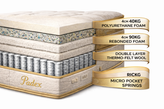 برای افزایش دوام و راحتی، روی فنرها دو لایه نمد مقاوم قرار گرفته که فشار بدن را بهصورت یکنواخت توزیع کرده و از وارد شدن ضربه مستقیم به فنرها جلوگیری میکند. همچنین، ترکیب یک لایه ریباند ۹۰ کیلوگرمی و یک لایه ابر ۳۵ کیلوگرمی، نرمی ایدهآل و پشتیبانی مطلوبی را برای بدن شما ایجاد میکند.