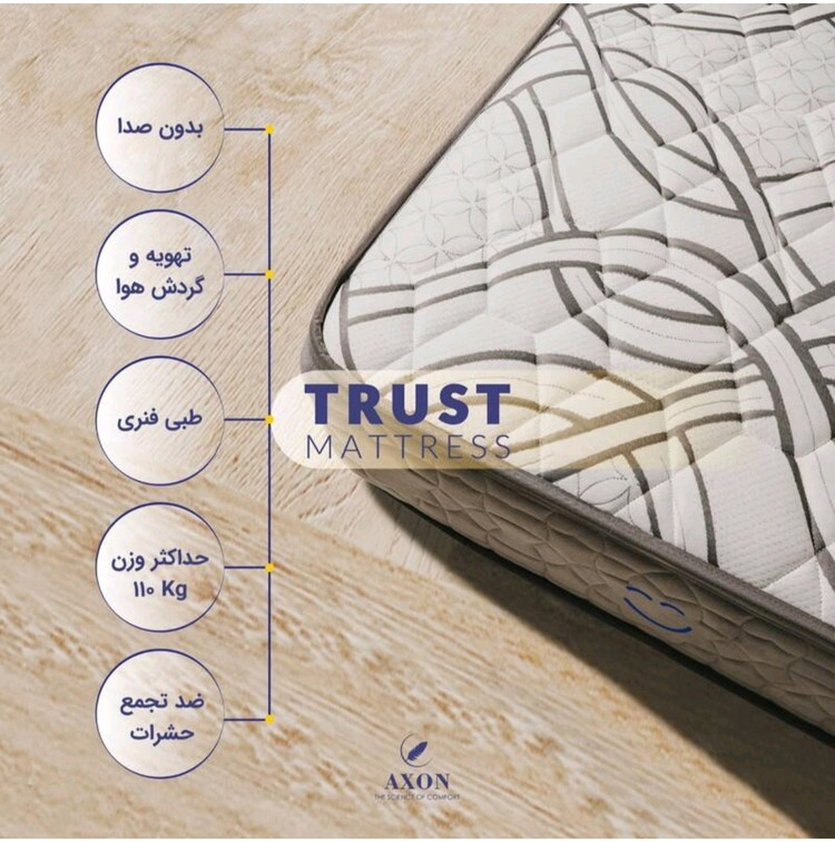 تشک تراست از سری تشک های ارتوپدیک مجموعه آکسون با سطح نسبتا سفت می باشد. که با تکنولوژی فنرهای میکرو به همراه تقویت کننده های M و با بکارگیری لایه های اسفنج با دانسیته بالا و فوم های ترموفیوز و ترموفلت از ایجاد ارتعاشات اضافه در تشک جلوگیری کرده و می تواند فشار های وارده بر بدن در اثر وزن را در سطح تشک به طور یکنواخت توزیع نماید. که این امر از آسیب به اندام های داخلی بدن جلوگیری و از ستون فقرات هنگام خواب حمایت می کند. این تشک برای تمامی گروه های سنی و با وزن حداکثر هر فرد 110 کیلوگرم توصیه می گردد