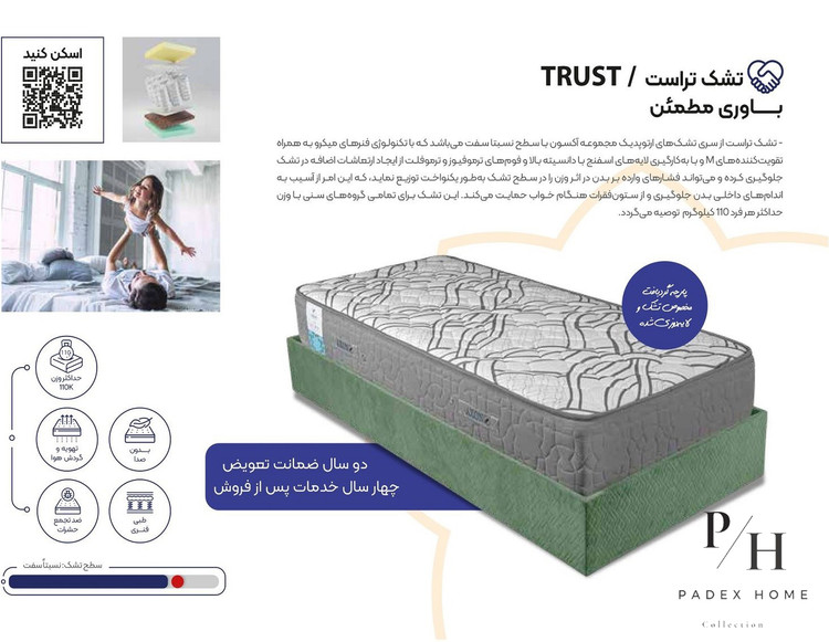 تشک تراست از سری تشک های ارتوپدیک مجموعه آکسون با سطح نسبتا سفت می باشد. که با تکنولوژی فنرهای میکرو به همراه تقویت کننده های M و با بکارگیری لایه های اسفنج با دانسیته بالا و فوم های ترموفیوز و ترموفلت از ایجاد ارتعاشات اضافه در تشک جلوگیری کرده و می تواند فشار های وارده بر بدن در اثر وزن را در سطح تشک به طور یکنواخت توزیع نماید. که این امر از آسیب به اندام های داخلی بدن جلوگیری و از ستون فقرات هنگام خواب حمایت می کند. این تشک برای تمامی گروه های سنی و با وزن حداکثر هر فرد 110 کیلوگرم توصیه می گردد