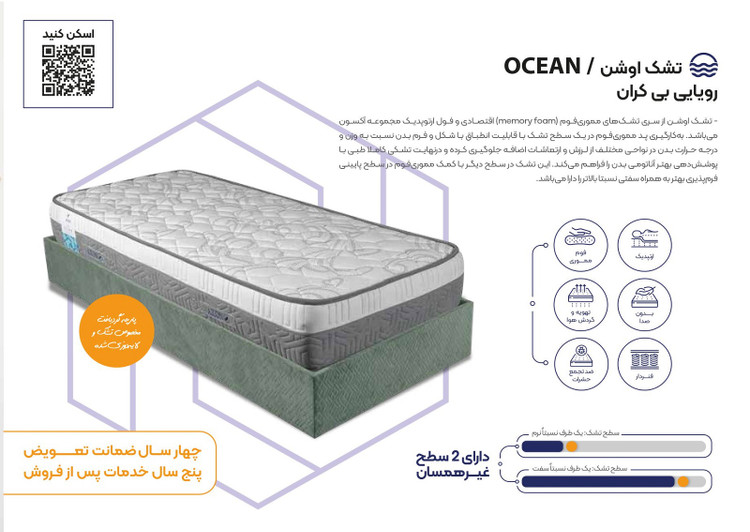 تشک اوشن از سری تشک های مموری فوم (memory foam) اقتصادی و فول ارتوپدیک مجموعه آکسون می باشد به کارگیری پد مموری فوم در یک سطج تشک با قابلیت انطباق با شکل و فرم بدن نسبت به وزن و درجه حرارت بدن در نواحی مختلف از لرزش و ارتعاشات اضافه جلوگیری کرده و در نهایت تشکی کاملا طبی با پوشش دهی بهتر آناتومی بدن را فراهم می کند. این تشک در سطح دیگر با کمک مموری فوم در سطح پایینی قرم پذیری بهتر به همراه سفتی نسبتا بالاتر را دارا می باشد.