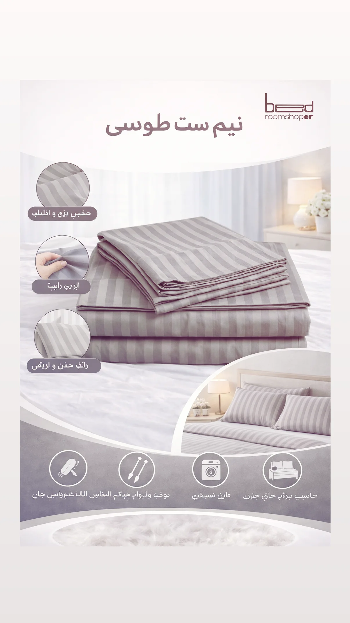 مدل 50Satin یا همان پارچه هتلی از بهترین نوع پارچه های نخی میباشد که طرفداران بسیاری دارد، لطافت و سازگاری با پوست از ویژگی های این پارچه است. کش دوزی بالا و پایین این محصول موجب فیت ماندن ملحفه بروی تشک شما می شود. این محصول متشکل از یک عدد ملحفه کش دوزی شده با سایز 180در 200 سانتیمتر در ارتفاع 30سانتیمتر و 2عدد روبالشتی 50 در 70 با دوردوز 3 سانتیمتری است