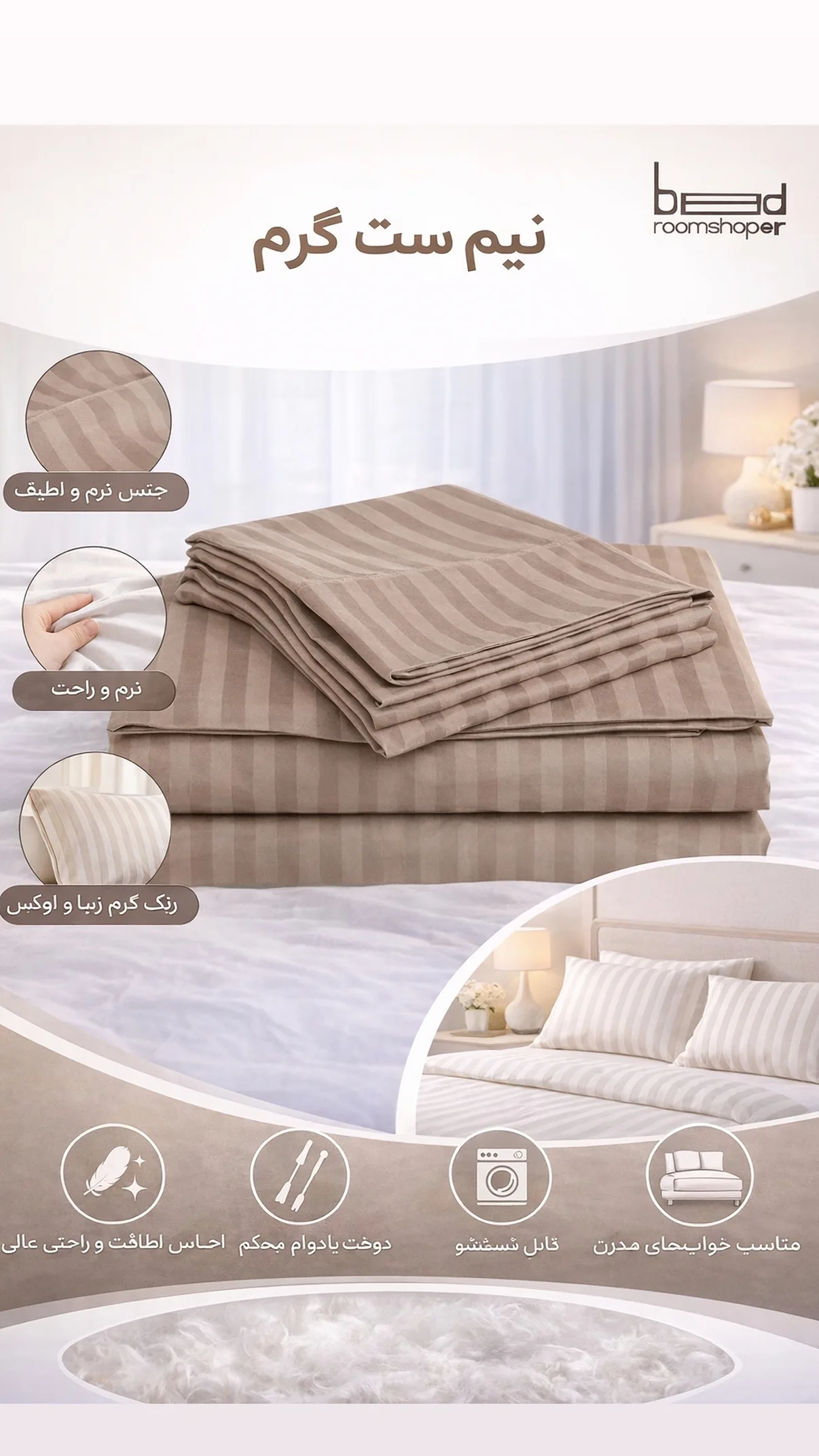مدل 50Satin یا همان پارچه هتلی از بهترین نوع پارچه های نخی میباشد که طرفداران بسیاری دارد، لطافت و سازگاری با پوست از ویژگی های این پارچه است. کش دوزی بالا و پایین این محصول موجب فیت ماندن ملحفه بروی تشک شما می شود. این محصول متشکل از یک عدد ملحفه کش دوزی شده با سایز 180در 200 سانتیمتر در ارتفاع 30سانتیمتر و 2عدد روبالشتی 50 در 70 با دوردوز 3 سانتیمتری است