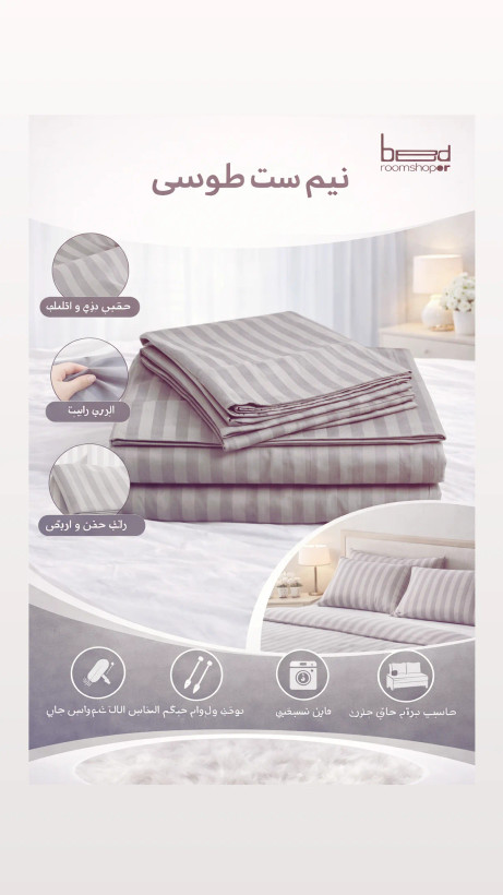 مدل 50Satin یا همان پارچه هتلی از بهترین نوع پارچه های نخی میباشد که طرفداران بسیاری دارد، لطافت و سازگاری با پوست از ویژگی های این پارچه است. کش دوزی بالا و پایین این محصول موجب فیت ماندن ملحفه بروی تشک شما می شود. این محصول متشکل از یک عدد ملحفه کش دوزی شده با سایز 180در 200 سانتیمتر در ارتفاع 30سانتیمتر و 2عدد روبالشتی 50 در 70 با دوردوز 3 سانتیمتری است