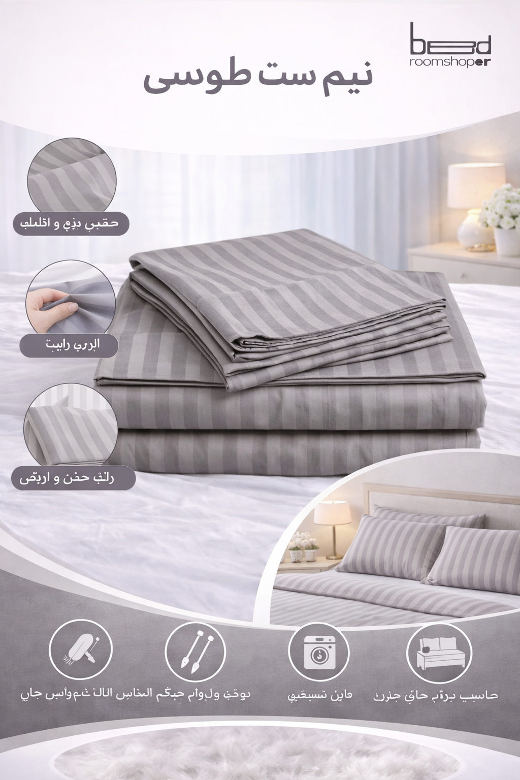 مدل 50Satin یا همان پارچه هتلی از بهترین نوع پارچه های نخی میباشد که طرفداران بسیاری دارد، لطافت و سازگاری با پوست از ویژگی های این پارچه است. کش دوزی بالا و پایین این محصول موجب فیت ماندن ملحفه بروی تشک شما می شود. این محصول متشکل از یک عدد ملحفه کش دوزی شده با سایز 180در 200 سانتیمتر در ارتفاع 30سانتیمتر و 2عدد روبالشتی 50 در 70 با دوردوز 3 سانتیمتری است