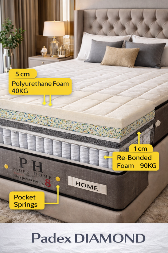 Padex pockets springبا طراحی مهندسیشده و متریال با دوام، همراه با ۸ سال گارانتی معتبر ارائه میشود تا خیال شما از بابت کیفیت و طول عمر کاملاً آسوده ultra pocket